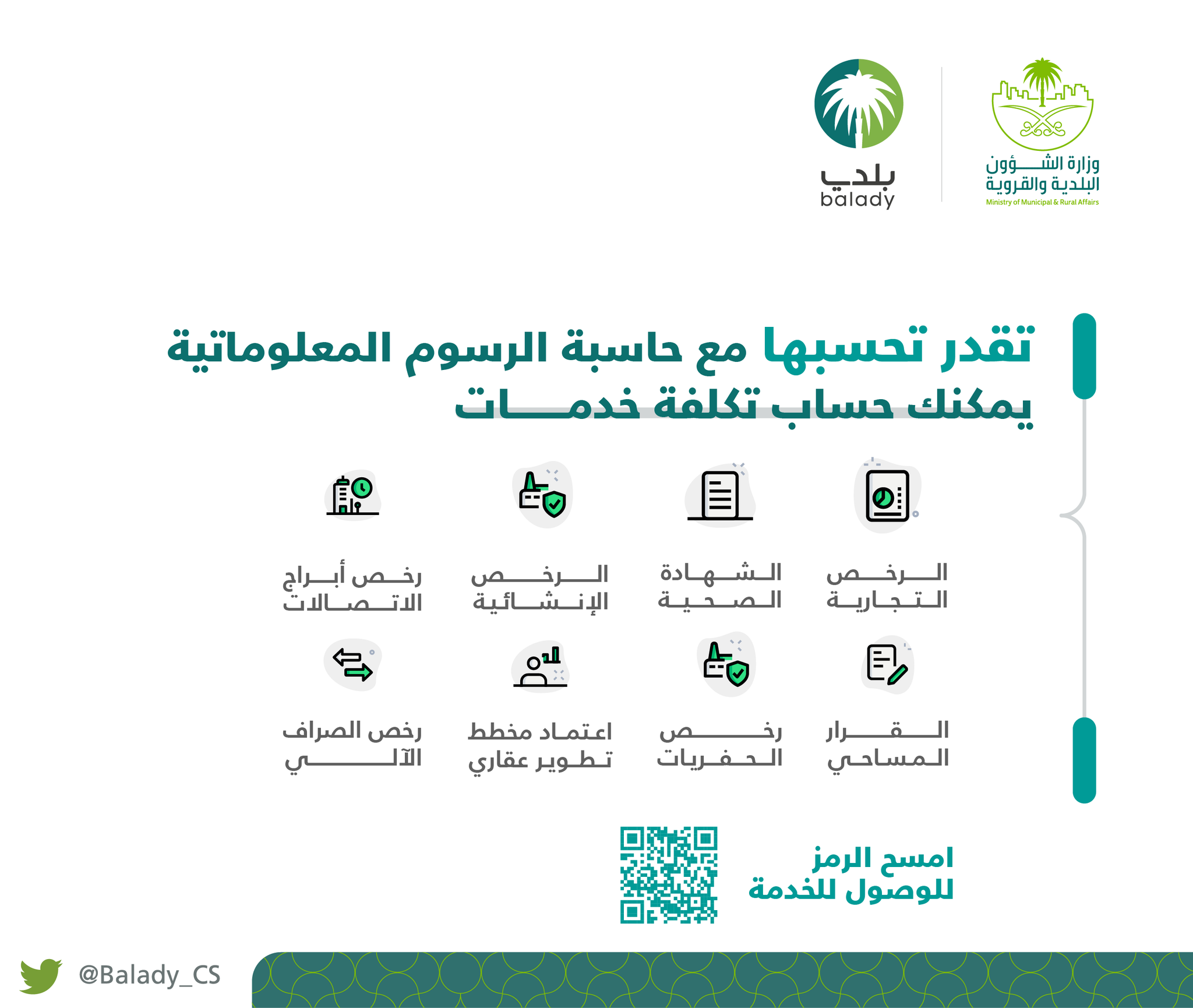 وزارة الشؤون البلدية والقروية تطلق خدمة حاسبة الرسوم المعلوماتية أطلقت وزارة الشؤون البلدية والقروية خدمة حاسبة الرسوم المعلوماتية عبر منصتها الإلكترونية بلدي وتهدف. إدخال رمز التحقق المرسل على جوال صاحب الشهادة. تسجيل الدخول لحساب مكتب هندسي مقاول موظف أمانة شركة منشأة.