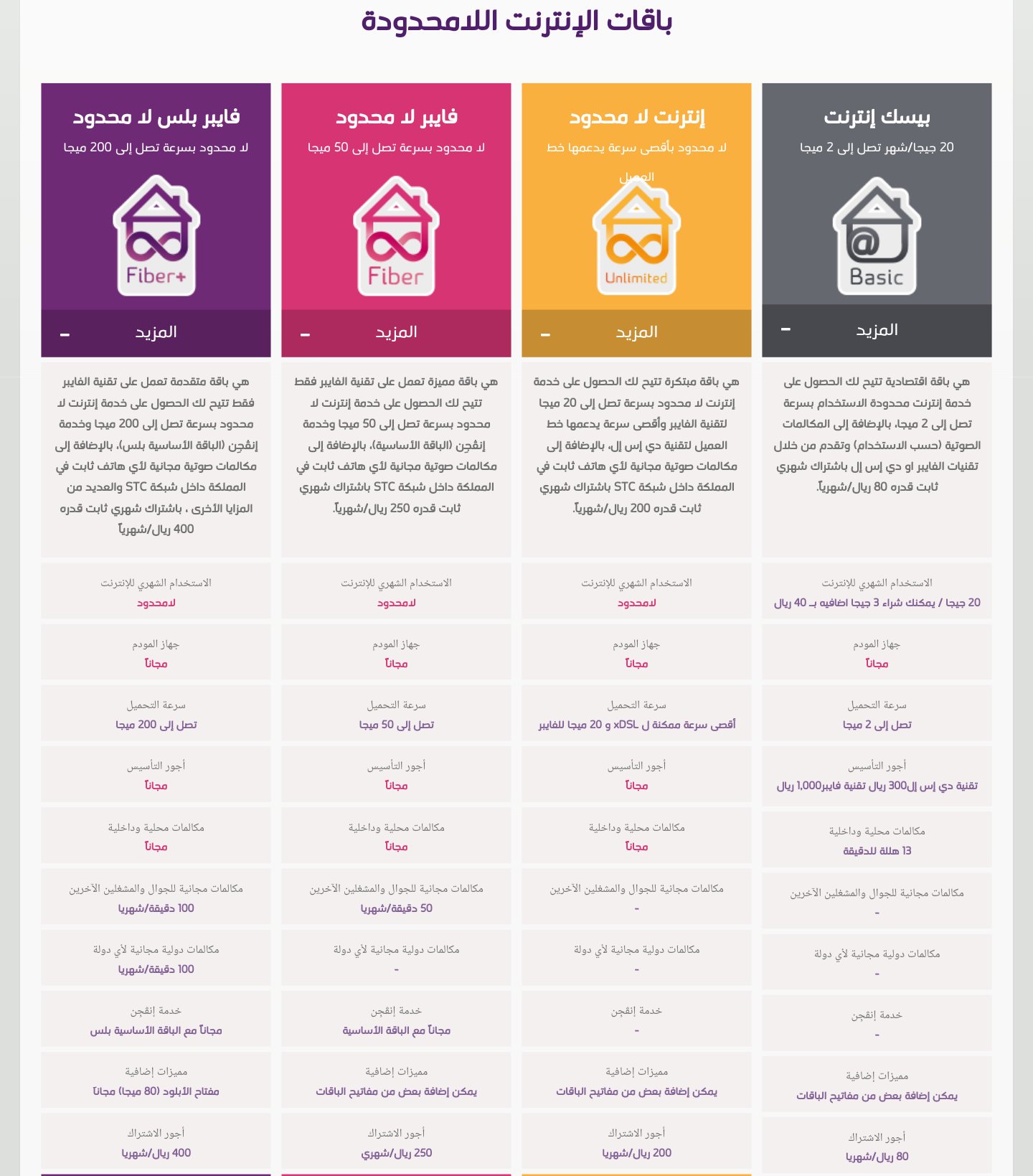سرعة 40 ميغا باشتراك شهري 299 ريال. باقة جود 3 سرعة 40 ميغا باشتراك شهري. اشترك بالالياف البصرية من stc واستمتع بارخص انترنت في السعودية وتعر ف على باقات الانترنت اللامحدود لتحصل على اسرع وافضل اتصال انترنت لمنزلك. سعر فايبر stc للعملاء الجدد 125 ريال سعودي شهر لأول ثلاثة أشهر و لكن سعر الباقة الأساسي 250 ريال سعودي شهر.