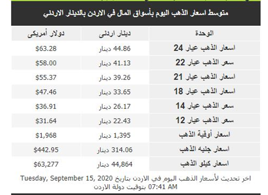أسعار الذهب ليوم الثلاثاء 15 9 2020 مال و أعمال زاد الاردن الاخباري أخبار الأردن