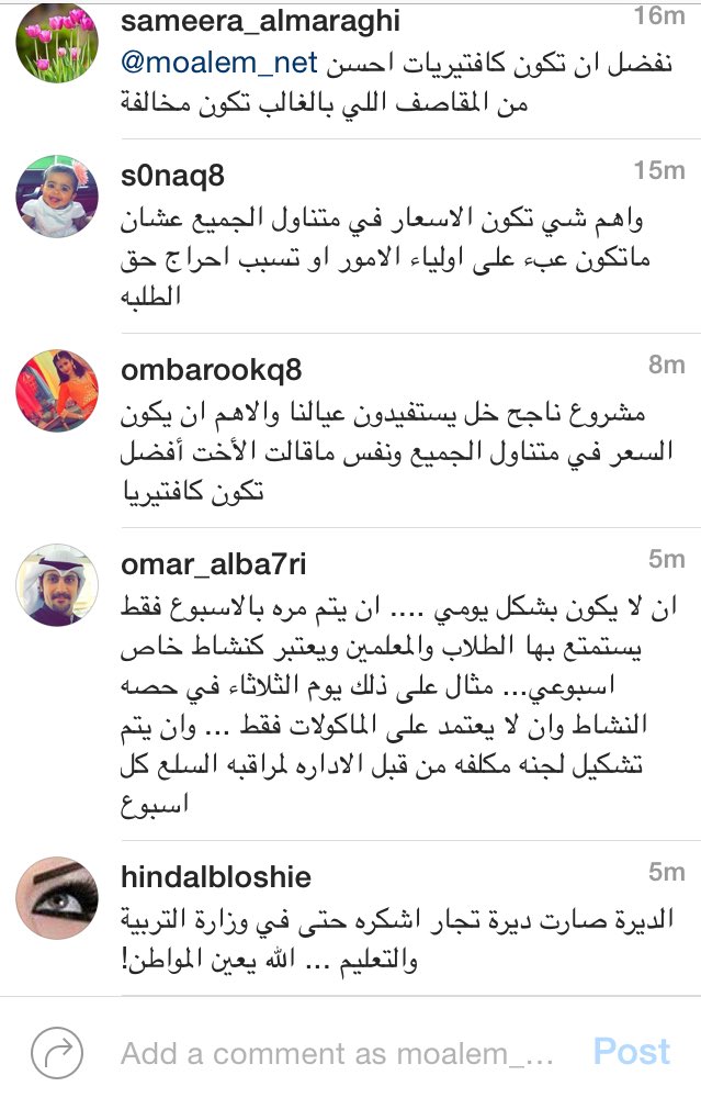 وأكمل محمد ان المقصف المدرسي في حاجة إلى تطوير وتنظيم وليس في حاجة لإسناده إلى أصحاب المشاريع الكبيرة وشركات الأغذية التي تنتظر فتح باب التعاقد معهم والتي تسعى كل منها للاستحواذ على أكبر. تردي المنهج و اكتضاضه عدم الحاجة لكل ما ندرسه في حياتنا المعلمين و المكاتب مصاصين فلوس روتين قليل ما يوجد مدارس بها نوادي ترفيهة نسيان كل ما درس في العطلة الصيفية. بتطوير المقصف المدرسي وتوفير الغذاء المناسب وهذا من يعمل بضمير خصوصآ المدير او المديرة هل نظلم المقصف المدرسي في مجتمعنا بقولنا هذا بالعكس هذا هو الواقع اضرب لكي مثال.