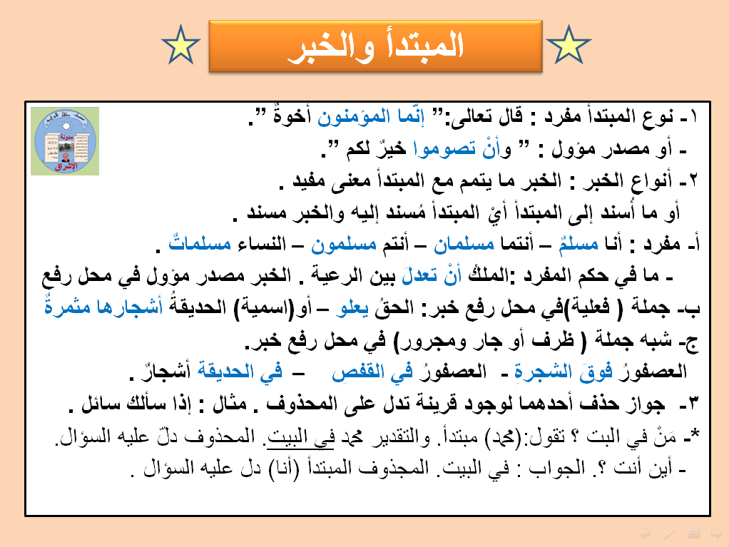 شرح المبتدأ والخبر بالتفصيل. شرح مبسط لدرس المبتدأ والخبر الصف الرابع الإبتدائيدرس أقسام الكلمة لسهولة التعرف على. تعريف إعراب أمثلة واضحة مرحبا بكم في موضوع جديد بعنوان شرح المبتدأ والخبر بالتفصيل حيث سنتناول أحكامهما وقواعدهما الإعرابية المختلفة مع أمثلة تسهل. شرح المبتدأ والخبر بالتفصيل والمبتدأ لا بد أن يكون معرفة فلا يصح أن نخبر عن نكرة حتى لا تصير الجملة بلا مدلول ولكن يوجد حالات معينة لاستخدام النكرة للمبتدأ ومن هذه الحالات ما يأتي. شرح المبتدأ والخبر بالتفصيل.