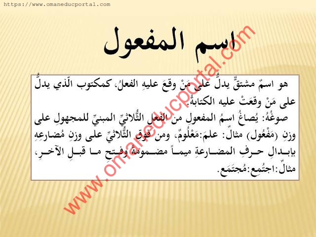 شرح درس اسم المفعول. المحسن مشكور عمله الوطن معظم مواطنوه. يتضمن الملف المرفق عرض بوربوينت لدرس اسم المفعول وهو أحد دروس مادة اللغة العربية للصف التاسع بقسميه العام والمتقدم وذلك وفق منهاج دولة الإمارات العربية المتحدة. تعريف اسم المفعول. أي الفعلين ينسجم في سياق معناه مع معنى الاسم محظورا.