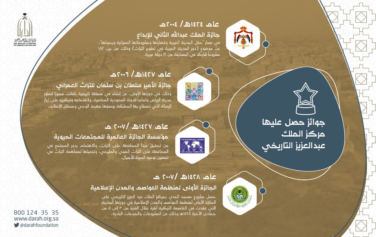 دارة الملك عبدالعزيز A Twitteren انفوجرافيك الدارة جـوائـز مركز الملك عبدالعزيز التاريخي حصل مركز الملك عبدالعزيز التاريخي على جوائز محلية وعربية للدور الذي يقوم في الحفاظ على الإرث الحضاري للبلاد منذ